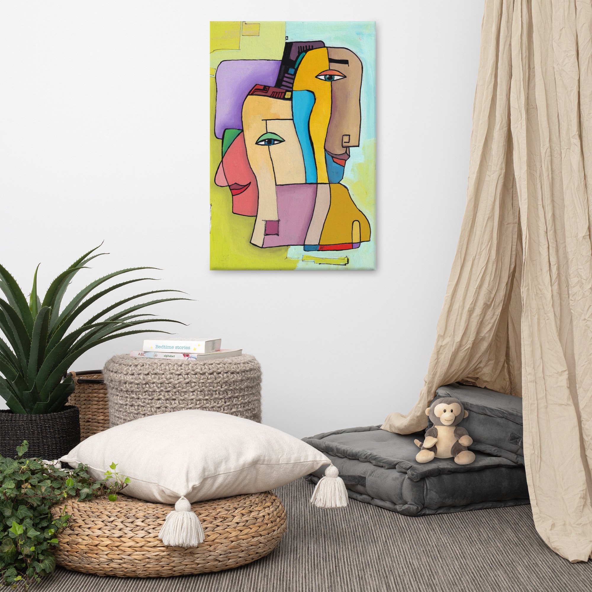 Looking to add a little flair to your room or office? Look no further - this canvas print explores the overlap of identities, emotions and perception. Through layered faces, shifting colors, and fragmented forms, the painting captures the tension that happens when different inner worlds interrupts and reshape one another. The result is a visual signal of collision, connection and quiet instability.